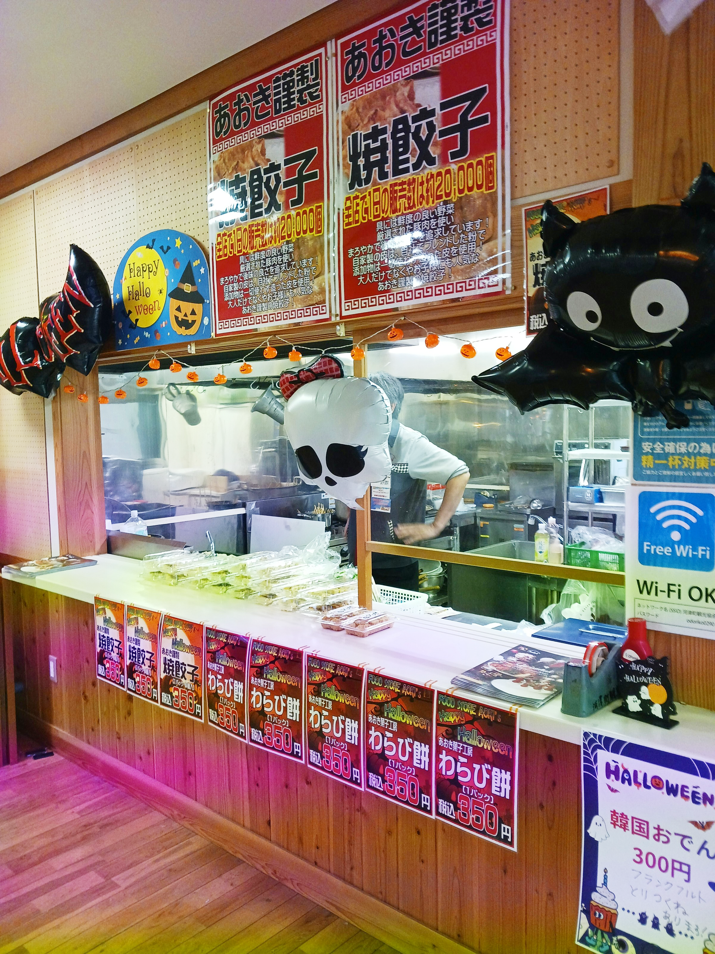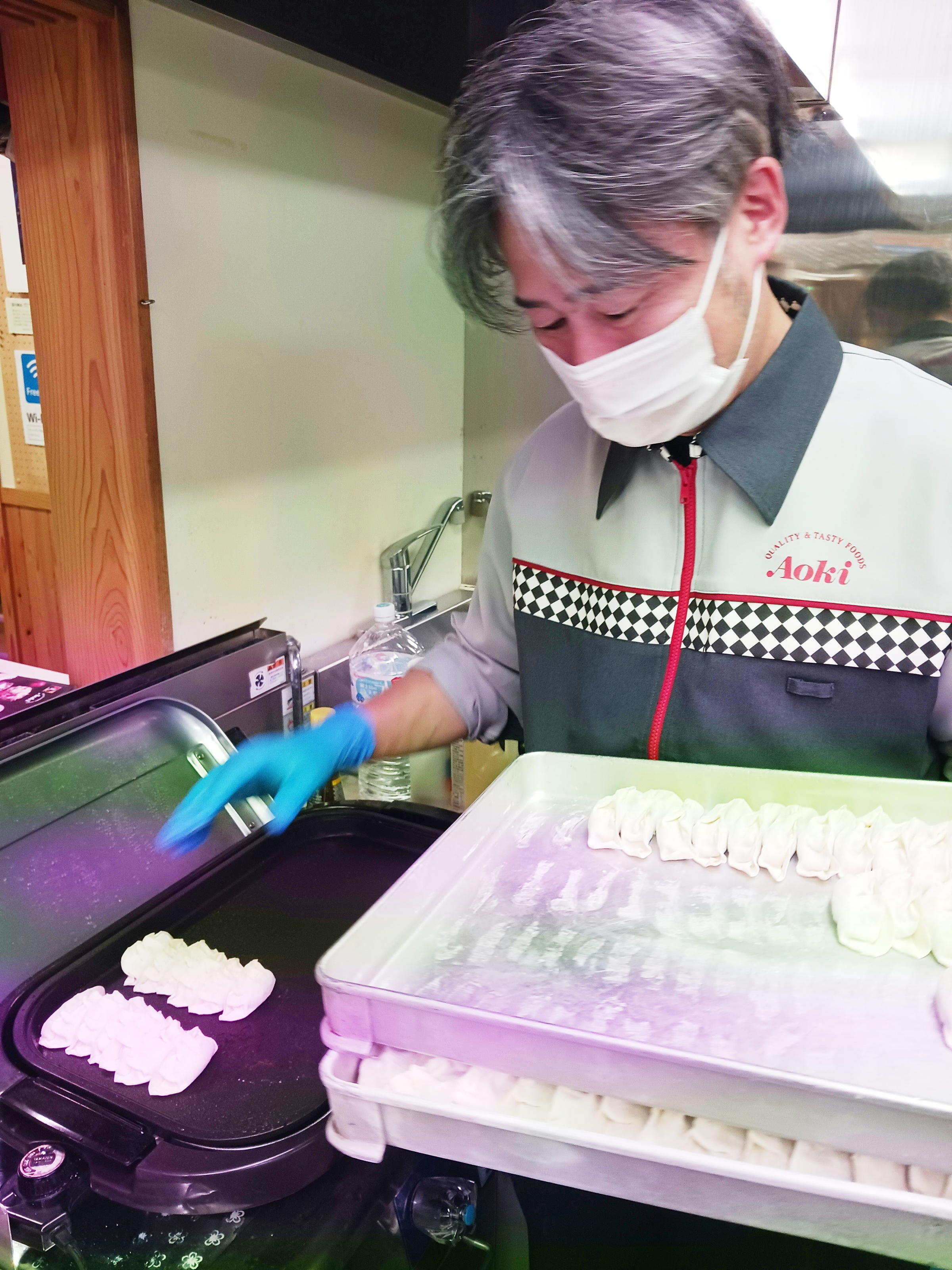 あおきは先方のご要望により、あおきの焼餃子とあおきフードのできたてわらび餅を販売しました。食べ歩きが主体の催しなので、餃子は初めてホットプレートで焼きました。