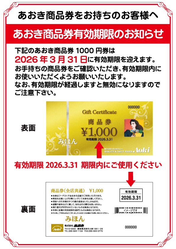 商品券有効期限期限のお知らせ(有効期限2026.3.31)